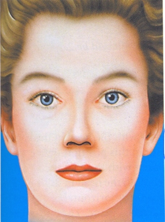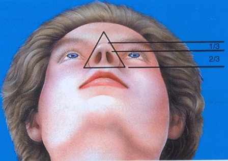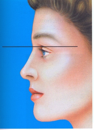 *فرو رفته ترین ناحیه بینی در ناحیه اتصال به پیشانی در نمای نیمرخ بین مژه های بالایی و چین پلک بالایی است (در صورتیکه بیمار به جلو نگاه کند).