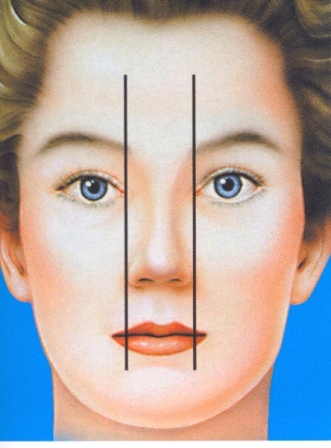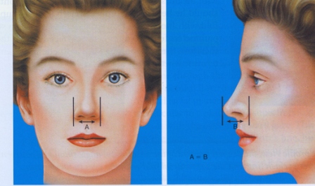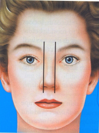 *پهنای قسمت پره های بینی باید تقریبا” مساوی فاصله گوشه داخلی دو چشم باشد که معادل پهنای یک چشم است.