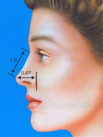 روش دیگر، اندازه گیری براساس طول بینی است. اگر طول بینی اندازه مناسب داشته باشد، میزان جلوآمدگی نوک بینی 0.67 این طول می باشد.